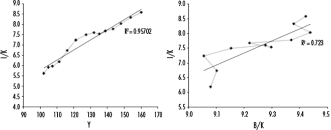 The relationship between I/K and B/K displays a significant linear correlation (see Figure 4b). Although this is a simple statistical exercise from which causal relationships should not be derived, it does offer an interesting initial approach to the behavior of these two variables. The correlation is nearly perfect between the evolution of the accumulation rate (I/K) and production (Y) (correlation coefficient 0.95), pursuant to the key role investment plays in accumulation and growth dynamics. The correlation between the profit and accumulation rates is also high between 1997 and 2007 (0.72), in other words, when the first three years, as profits spiked due to the change in cycle, are eliminated from the sample. Although these results are interesting, further research is needed to empirically test this theoretical perspective.
