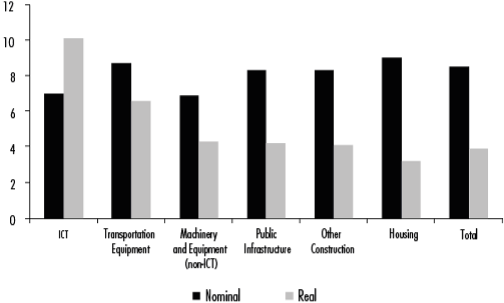 Figure 1 shows the average growth rate of the principal assets in real and nominal terms. As can be seen, when the difference between the nominal and real terms is high and positive in the majority of assets (up to a maximum of 5.8 percentage points for real-estate assets), this spread differs considerably among the various types of assets and is even negative in the case of ICT (-3.1 percentage points). As such, when we consider the effect of prices, we observe that the evolution is contrary in real terms as compared to nominal terms, meaning that (at constant prices) ICT assets grow at a higher annual average rate (10.1%), while real-estate assets grow at 3.2% annually. Consequently, "contrary to what is frequently stated, housing is not the capital that has grown the most in real terms nor, much less, has it impeded high investment growth in other productive assets, such as machinery and equipment or ICT" (Pérez García, 2009).