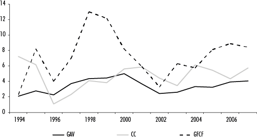 Figure 2 Growth of GAV, GFCF, and Company Profit (CC), Annual Variation Rates at Constant Prices from 1995