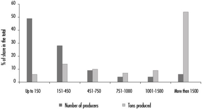It was in this way that the longest agricultural conflict in the history of Argentina emerged, which would eventually five rise to the first political and economic defeat of Kirchnerism. The initial proposal in the "125! contained various weaknesses: it did not differentiate between different agents (for example, by size and geographic location) and lacked an adequate communication strategy and strategy to build consensus. The agrarian pole managed to achieve strong unity around the central demand against with withholding taxes, calling them an interventionist aggression by the State in the sector, and resorting to, at the ideological level, the maxims of the minimalist State and the vision of Argentine "farming" as the motor of development. In turn, political progress in this pole led to long years of a triple concentration process: of land, capital, and the processes of management and productive organization (Varesi, 2014), which meant that by 2008, a mere 6% of economic agents, mainly large owners, seed pools, and agriculture and livestock-financial companies, which produced more than 1,500 tons per campaign, accounted for 54% of total soy production.