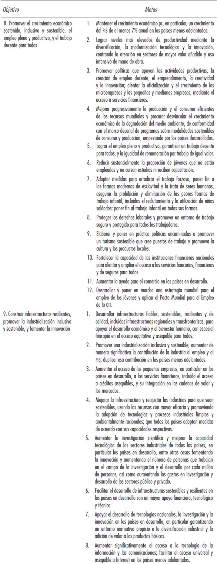 Los dos objetivos y sus 20 metas se definen como la agenda económica de los ODS en la discusión subsecuente de este trabajo. En su contenido detallado los objetivos 8 y 9 están orientados a alcanzar crecimiento sostenido, industrialización, pleno empleo y trabajo decente. Las metas establecen medios y acciones principalmente dirigidas a la diversificación productiva, la modernización tecnológica y la innovación; el fortalecimiento y acceso financiero en especial para atender a pequeñas y medianas empresas; el desarrollo de infraestructuras, gasto en investigación y desarrollo, tecnologías de la información; y las políticas de trabajo decente, racionalización de los recursos y sostenibilidad ambiental.