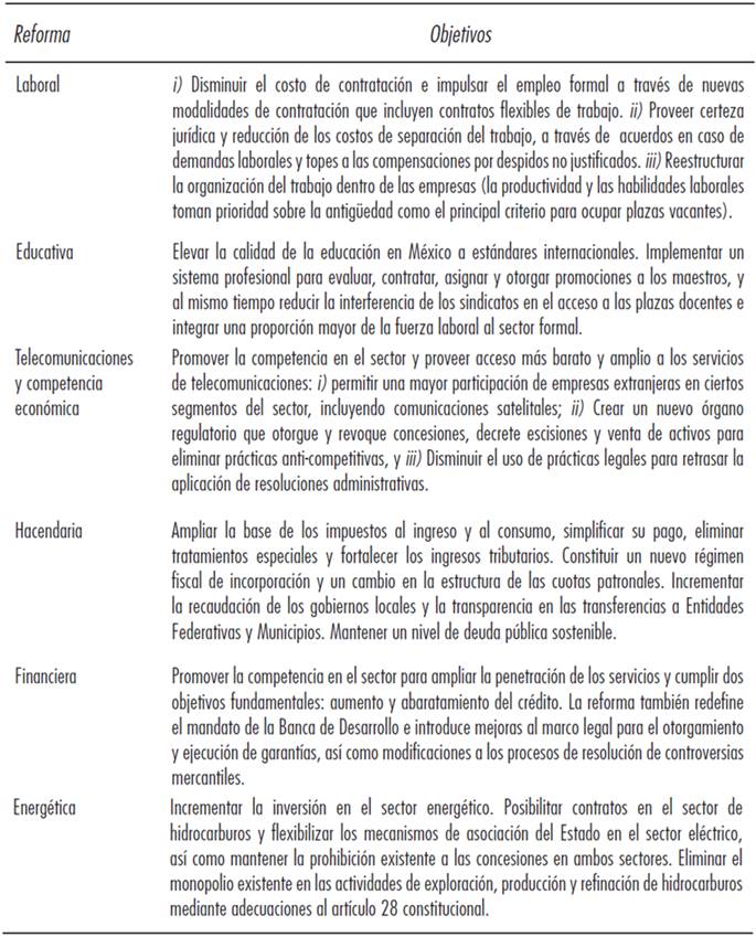 En concordancia con estos factores se han formulado varias de las reformas estructurales de la historia mexicana reciente. Entre ellas, las más trascendente en materia de desarrollo económico, se encuentran la reforma laboral, la educativa, la de telecomunicaciones y competencia económica, la hacendaria, la financiera, y la energética. Estas reforzaron el espíritu aperturista y privatizador de la política económica conforme al precepto de alcanzar la eficiencia en los mercados. La compatibilidad de esta orientación reformista (véase cuadro 3) con las políticas nacionales necesarias para alcanzar las metas de la agenda internacional de desarrollo es una cuestión a evaluar.