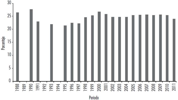 En referencia al cambio sectorial de la economía mexicana, las cifras del Banco Mundial señalan que entre 1988 y 2011 el empleo industrial como porcentaje del empleo total alcanzó en promedio alrededor de 25% y no presentó variaciones importantes a través del periodo (véase gráfica 7). Anteriormente se ha señalado que la economía mexicana se ha orientado mayormente a los servicios y el comercio, sectores que se han caracterizado por su baja productividad y tecnología.