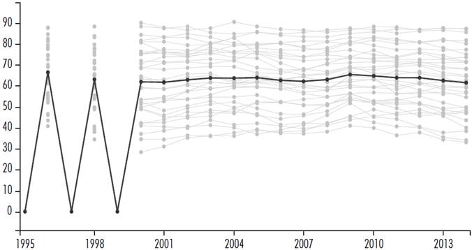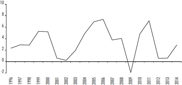 Las tasas de crecimiento del PIB por persona ocupada son una medición de la evolución de la productividad laboral en el país. El crecimiento de la productividad ha sido limitado (apenas por arriba de 3% promedio anual) y volátil en el periodo 1996-2014 (véase gráfica 5). Este comportamiento hace vislumbrar retos y problemas sustanciales para alcanzar un crecimiento sostenido de al menos 7% anual en los años de vigencia de la Agenda 2030, y permite advertir la necesaria revisión de metas realistas y alcanzables en estos rubros acorde a la actual situación de cada país.