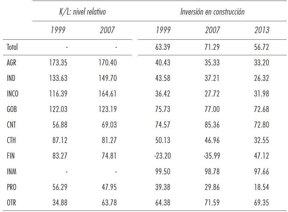 La participación de la inversión en viviendas y otras construcciones (columnas 3 a 5 del Cuadro 2) posee una cierta relación directa con el nivel de mecanización, aunque existen elementos a subrayar. Los sectores agrícolas, industriales y de la información y comunicaciones poseen un nivel relativo de inversión en activos de la construcción sustancialmente inferior al promedio (26-43% del total), mientras que las actividades gubernamentales, a pesar de su mayor ratio K/L, son intensivas en este tipo de inversión, lo cual revela la participación del sector público en el auge de la construcción.15 Por su parte, la construcción y los otros servicios son intensivos en tales activos (64-85% del total de la inversión recibida), mientras que comercio, transporte y hoteles apenas tienen una participación ligeramente superior a las del primer grupo (47-50%) y, en el caso de los servicios profesionales, un nivel relativamente reducido.