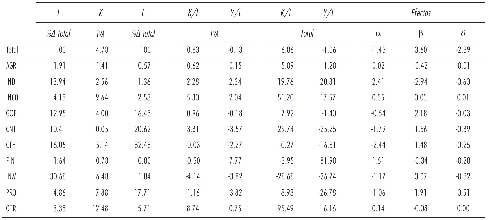 Notas. datos en porcentaje, de las tasas anuales de variación (TVA) del stock de capital (K), trabajo (L), ratio capital-trabajo (K/L), productividad (Y/L); estructura sectorial en porcentaje de la variación (Δ) del empleo; niveles sectoriales de K/L respecto del promedio; y efectos de productividad: intraindustrial (α), intersectorial estático (β) y dinámico (δ)