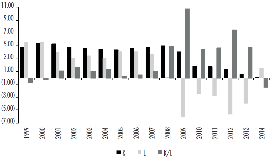 Esta dinámica se ha modificado radicalmente con la crisis, ya que entre 2008 y 2014 la tasa de acumulación de capital se desploma (véase Gráfica 1). De crecer casi al 5% hasta 2007 pasó a hacerlo sólo al 1.6% anual, y con un perfil descendente. En verdad, la gran caída se produce en 2010, y en 2014 este stock sólo aumenta un 0.07%. Como resultado, a partir de 2008 se produjo una caída absoluta del empleo total y asalariado del -3.2 y -3.1% anual promedio, respectivamente. De un máximo en 2008 de 16 624 millones de asalariados en el ámbito de referencia, seis años después sólo había 13 626 millones, lo que supone una caída del -18%. Paradójicamente, el ratio K/L se incrementó al 5% anual, precisamente debido a este mayor descenso relativo del denominador (L).