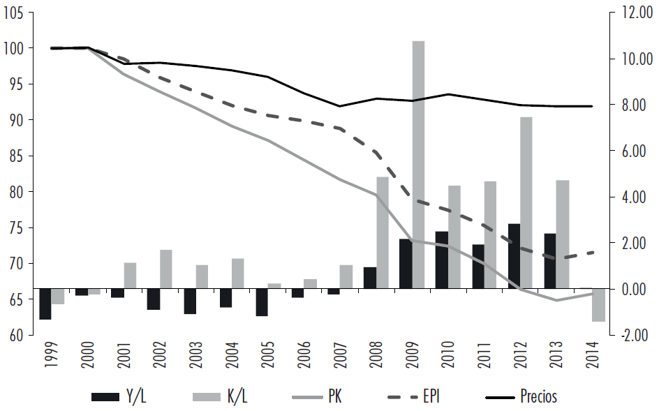 Notas: productividad del capital (Y/K) (PK), eficiencia productiva de la inversión (ratio productividad laboral (Y/L) respecto de la relación capital-trabajo (K/L), EPI) y ratio de precios del producto y el capital (Pyk), en índices (1999= 100).