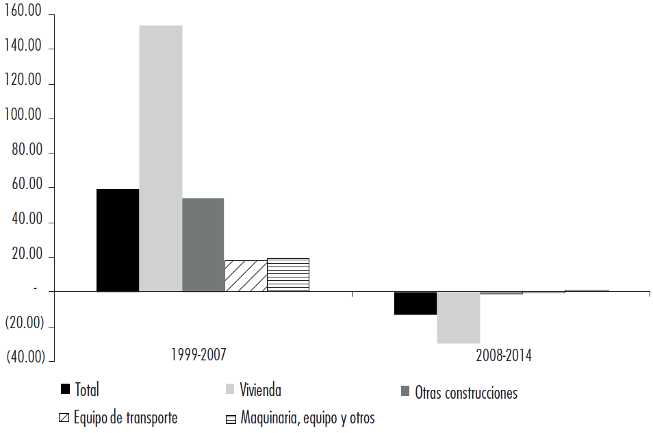 Este periodo comprende dos subfases, la de crecimiento y la de crisis. Aunque la primera finaliza en la segunda mitad de 2008, se tomará el lapso 1999-2007 como referencia. La expansión económica en este periodo (1999-2007) ha sido muy intensa, con tasas de crecimiento promedio del producto interno bruto (PIB) y del PIB per cápita de 3.77 y 2.27% anual, respectivamente, sustancialmente superiores a la eurozona-12 y la Unión Europea-28 (AMECO, 2016). Según el Instituto Nacional de Estadística (INE) (2015), la formación bruta de capital fijo creció a un ritmo promedio del 6.0% anual, superior no sólo al PIB, sino también al consumo de los hogares (3.5%), el gasto público (5.0%) y las exportaciones (4.7%). Sólo fue sobrepasado por el extraordinario auge de las importaciones (7.0%), lo que se explica por las condiciones de inserción externa en la eurozona. Por tanto, el proceso de acumulación ha sido también cuantitativamente el motor de la economía española, con la particularidad de que ha sido impulsado por la revalorización de los activos de la construcción, sobre todo residenciales, lo que se refleja en el alza del 169% de los precios de la vivienda (Ministerio de Fomento [MF], 2016; Mateo, 2017; Rodríguez y López, 2011). El colapso económico de 2008 generó una larga depresión de la que todavía no se ha recuperado España.5