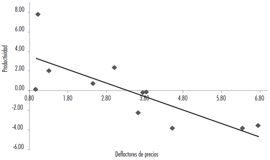 Notas: tasas anuales de variación de los deflactores sectoriales de precios y los correspondientes índices de productividad, incluyendo el promedio total de la economía, las finanzas y el ámbito inmobiliario.