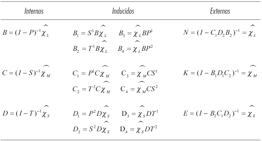 donde I es la matriz identidad, A la matriz de coeficientes técnicos que muestra la proporción de insumos respecto al nivel de producto de cada rama, f es la demanda final y L es la matriz de multiplicadores del producto. A partir de esta definición, se puede calcular el producto generado por las exportaciones tal como sigue: