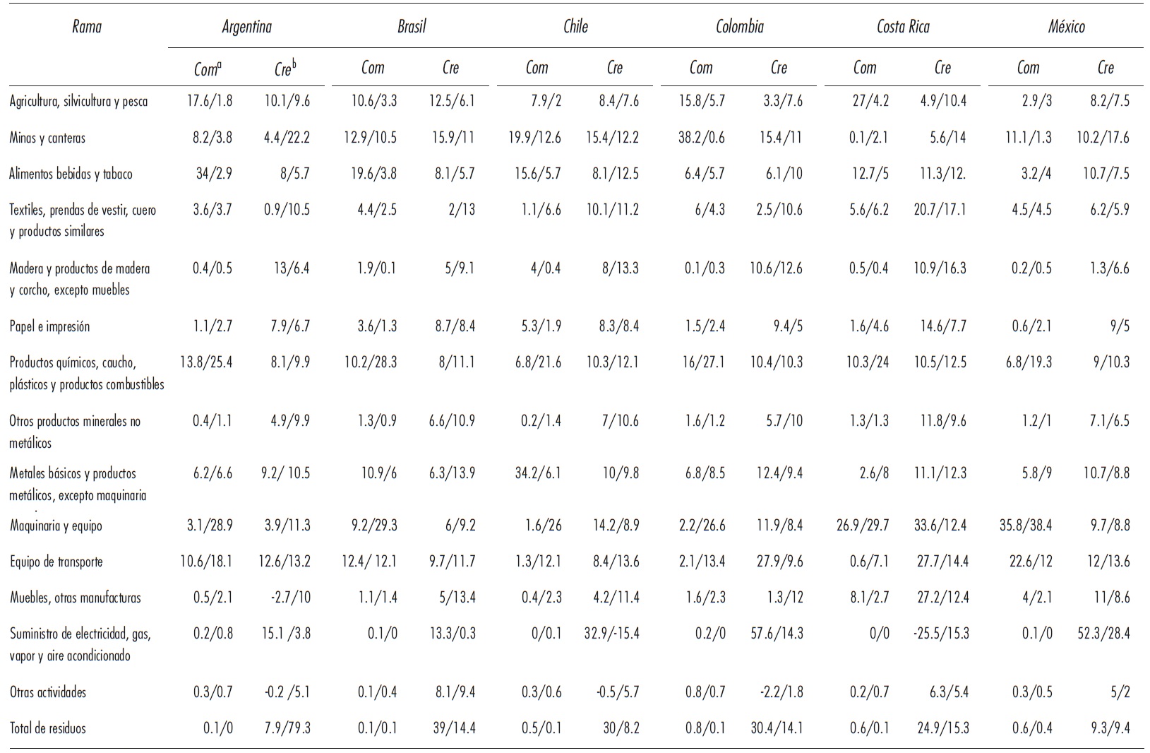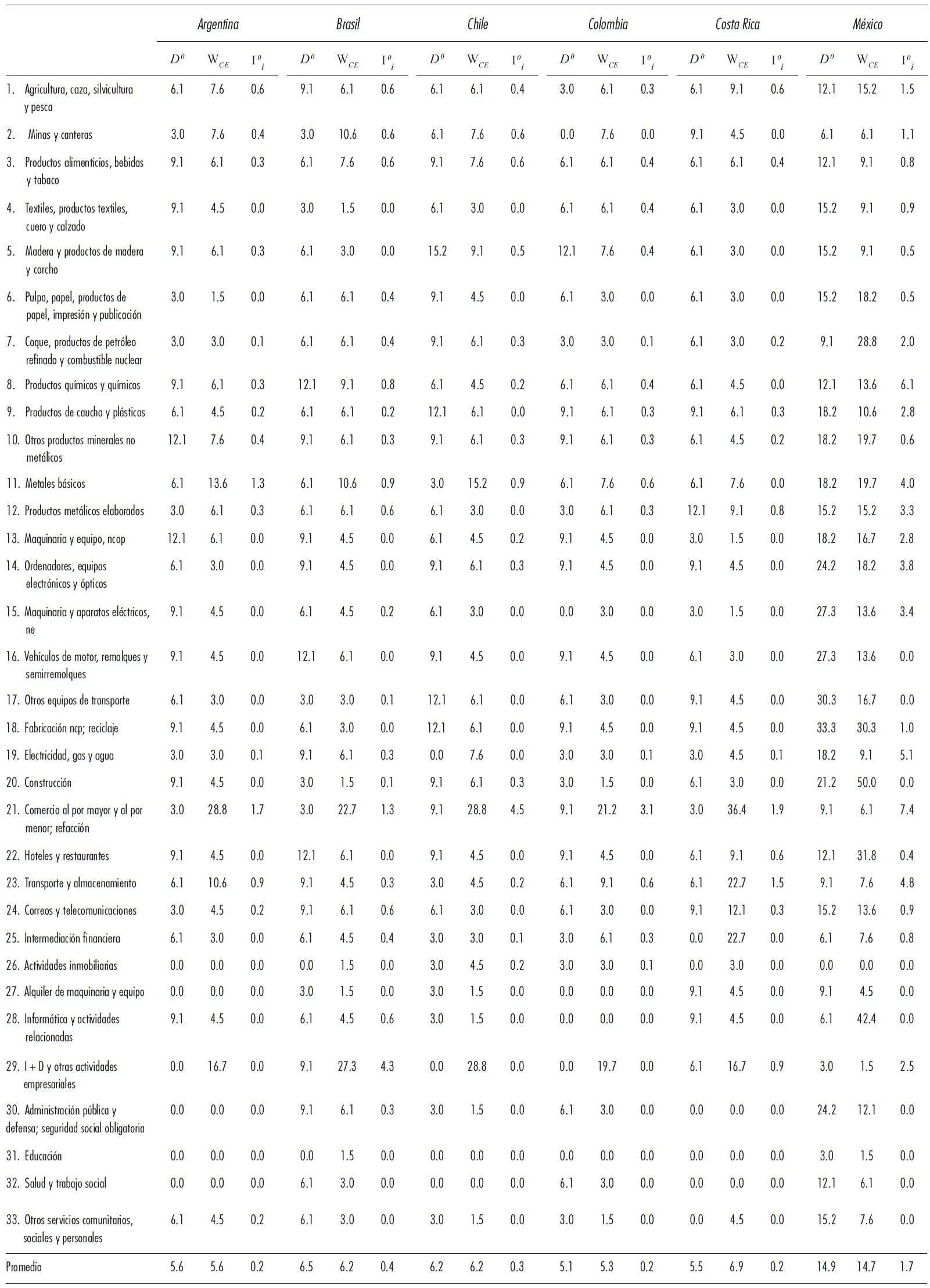 Las industrias que contribuyen más en las exportaciones son alimentos, bebidas y tabaco para el caso de Argentina y Brasil (34 y 19%, respectivamente), en Chile la rama de los metales básicos y productos metálicos, excepto maquinaria y equipo (34.2%); en Colombia las actividades de minas y canteras (38.2%), y en Costa Rica y México son la maquinaria y el equipo (26.9 y 35.8%, respectivamente). No existe una actividad industrial exportadora que caracterice al grupo de seis países; sin embargo, la rama más dinámica corresponde a minas y canteras en Brasil y Chile (del 15.6% en promedio), en Argentina es madera y productos derivados y corcho, excepto muebles (13%); la maquinaria y equipo (33.6%) en Costa Rica, y en Colombia y México, el equipo de transporte (27.9 y 12%, respectivamente).