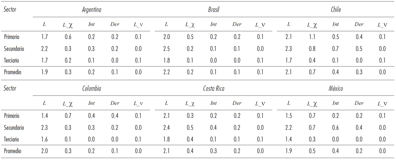 Los resultados de L v colocan a los países en tres grupos, según el promedio sobre la estructura. Brasil es el que tiene el mayor L v (0.06); el segundo grupo pertenece a Argentina, Chile, Colombia y Costa Rica (0.05) y, finalmente, México (0.04). Una característica de estos resultados es que el L v promedio es mayor en el sector primario, luego los servicios y, por último, el sector manufacturero, no obstante el L v manufacturero de Brasil es el que nuevamente mayor tamaño presenta.