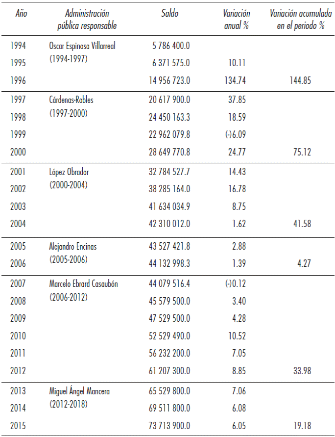 Con los datos de la Cuenta Pública es factible identificar la variación anual y acumulada de los saldos totales de deuda para la Ciudad de México, por responsable de la administración. Como se observa en el Cuadro 1, destaca la tendencia a reducir su tasa de crecimiento a lo largo de la serie.