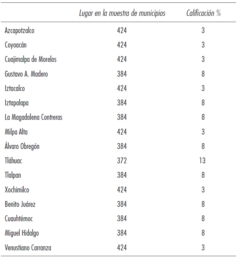 En el Cuadro 5 se observa que la calificación para las delegaciones de la Ciudad de México es baja en comparación a la media nacional, promedian 6.1% en materia de transparencia y ocupan los últimos lugares, el promedio de las 16 delegaciones es de 400 según los 453 municipios medidos por el IMCO como muestra representativa nacional.