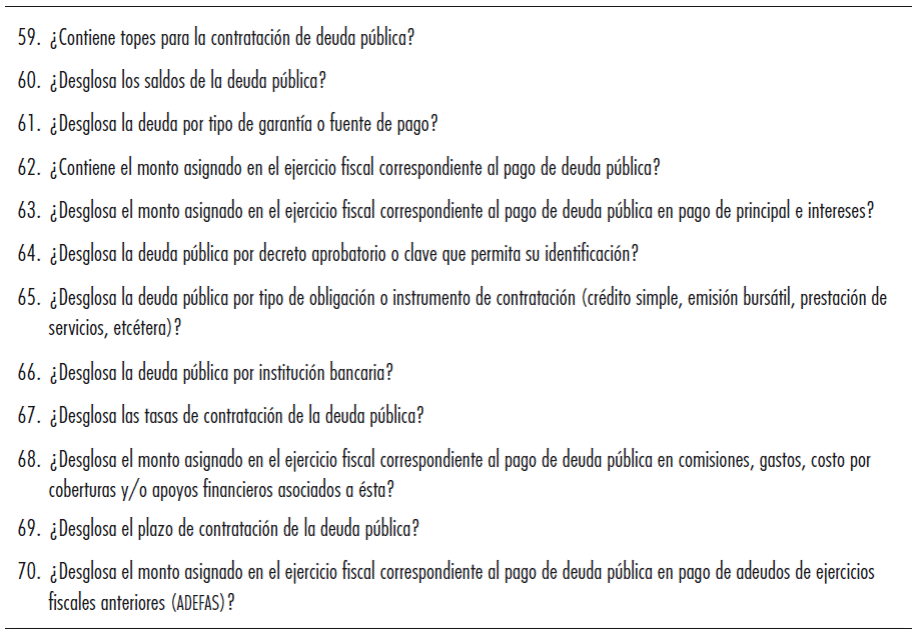 Obsérvese que no se pregunta por el desglose en el destino de deuda. Esto último es importante porque de origen se omite evaluar un aspecto fundamental de la transparencia.