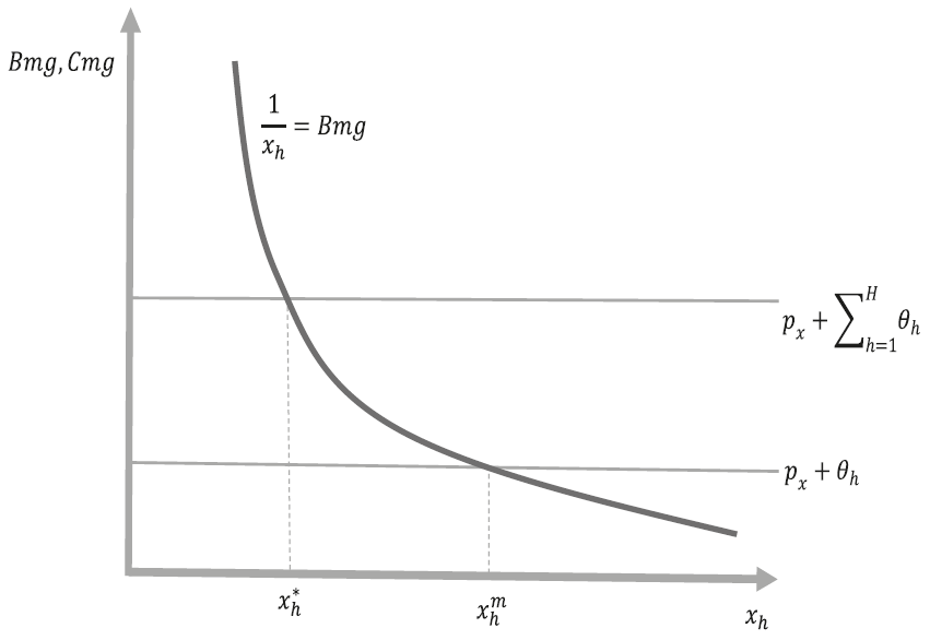 Donde v h = ln (x h ) - θ һ х һ representa la estructura de preferencias de la familia tipo h donde x h es el consumo privado del bien χ y θ һ > 0 es una constante. El consumo del bien x h causa una externalidad negativa a todas las familias en la economía, ya que este bien causa contaminación (considere aquellos bienes cuyo consumo induce un efecto residual en la contaminación ambiental). Sin embargo, la familia tipo h sólo considera cómo el consumo de este bien afecta su propio bienestar sin tomar en cuenta la externalidad negativa que su consumo causa en el resto de las familias de la sociedad. El efecto personal de la contaminación del bien x h en la familia tipo h está dado por -θ һ х һ .