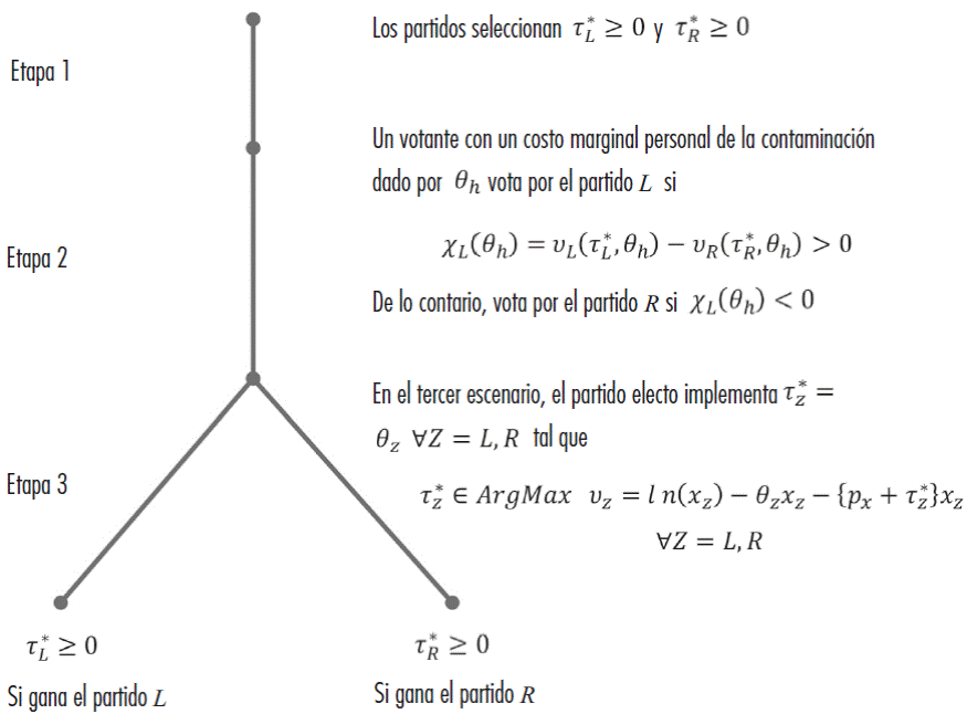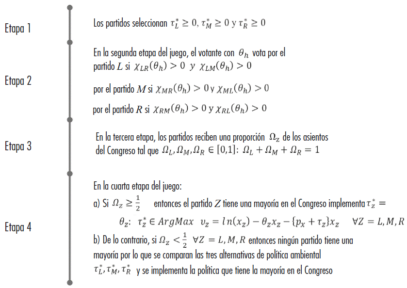 Así, en esta economía, el diseño de política ambiental se estudia a través de un juego dinámico de información perfecta donde el equilibrio político involucra las siguientes etapas: