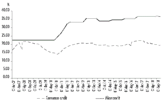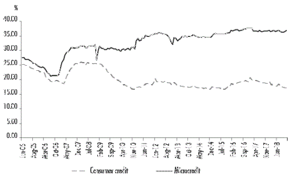 In 2007, Resolution 428 from the Financial Superintendence of Colombia (Superintendencia Financiera de Colombia, SFC) initiated a differentiated interest rate regime according to credit modality. In this regime, microcredit has a higher interest rate than consumer credit (see figure 4), due to the associated operating costs and greater risk involved. furthermore, Resolution 01 of the National Council of Microenterprises, enacted in 2007, established maximum fees and commissions, in which loans under 4 SMMLV would be charged a maximum rate of 7.5% and those between 4 and 25 SMMLV a rate of 4.5%, in addition to value added tax (VAT), for both values.