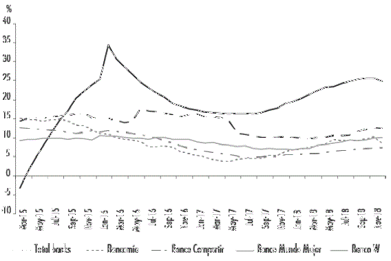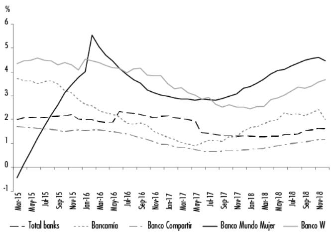 Confirming Larrain’s (2009) proposition, in Colombia some credit institutions focused solely on microfinance such as Bancamía, Banco Compartir, Banco Mundo Mujer, and Banco W have a return on assets (ROA) above the average for the traditional banking sector (see Figure 1), and, although the return on equity (ROE) does not show the same behavior (see Figure 2), Banco W greatly exceeds the sector for this indicator, and the other banks focused on microcredit are on course to follow this trajectory.