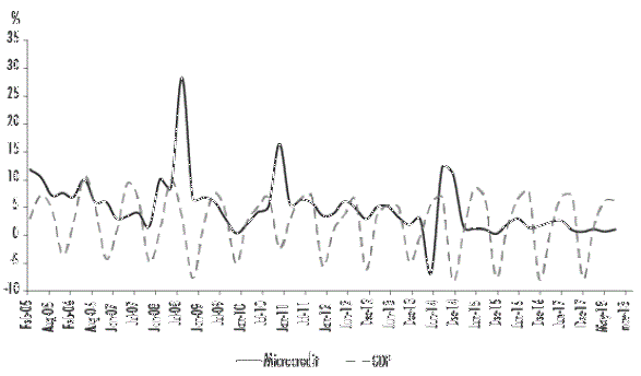 Although microcredit initially reported high growth rates in Columbia (see Figure 3), in recent years it has stabilized and has, at times, had an inverse relationship with GDP growth rate, which could be due to the fact that, as economic growth decreases, employment also decreases, with the outcome that subsistence enterprises increase and, therefore, the demand for microcredit. This relationship will be addressed later in this article's methodology.