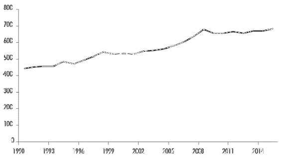 In 1992, Mexico signed the United Nations Framework Convention on Climate Change (UNFCCC), thereby committing to comply with the guidelines established in the instrument. One such guideline is to develop and update a national GHG inventory, based on the methodology put forth by the Intergovernmental Panel on Climate Change (Instituto Nacional de Ecología y Cambio Climático [INECC], 2018). For this purpose, historical data is available on the evolution of anthropogenic GHG emissions by their different sources for the period 1990-2015, expressed in metric tons of CO2e.1 Figure 1 shows the trajectory of total emissions (without factoring in absorption), measured in tons of CO2e. This trajectory maintained an upward trend during the period 1990-2015, going from a level of 444.7 million tons of CO2e in 1990 to 683 million in 2015, i.e., an increase of 53.6% with an average annual growth rate of 1.7%.