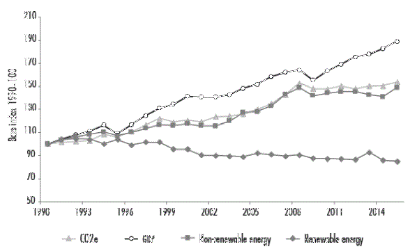 After the 2008 international crisis, there was an important change in the trends of the three variables. Between 2009 and 2015, GDP growth averaged 3.3% annually, while non-renewable energy consumption and CO2e reported growth of 0.8% and 0.6%, respectively. This result could indicate that, after the 2008 crisis, there has been a degree of decoupling between the level of output and emissions, yet without decoupling the evolution of non-renewable energy from the trajectory of GHG emissions, as energy generation is still largely based on burning fuels.