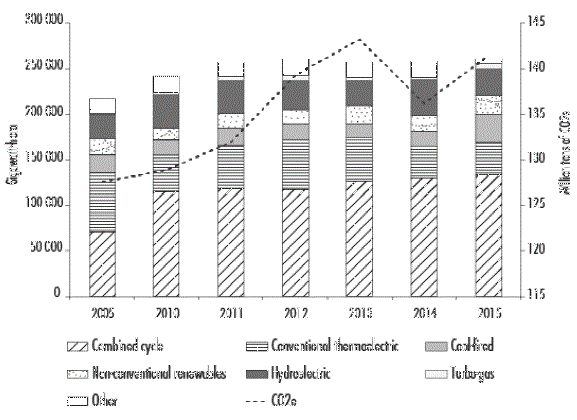 Regarding the electricity sector, the last 15 years have seen a shift in the technologies used in energy production. For example, in 2004, 39.6% of the supply came from conventional thermoelectric power plants whose main fuel was fuel oil; combined cycle technology (which uses natural gas) contributed 22%; non-conventional renewable energies (solar, wind, geothermal, and nuclear) 7.6%; while coalfired power accounted for 8%. In 2015, the main technology used was combined cycle, accounting for 51.5%, with a decrease in conventional thermoelectric plants to 13.7%. Non-conventional renewable sources have remained unchanged, while coal-fired plants recorded a slight increase in their share to 11.5% (see Figure 3). This increase in natural gas consumption has allowed for the stabilization of GHG emissions derived from electricity generation, especially since 2013, with an annual average of 140 million tons (see Figure 3); however, an increase in energy demand could generate a rebound in emissions, as 79% of electric energy is obtained via burning fossil fuels.4