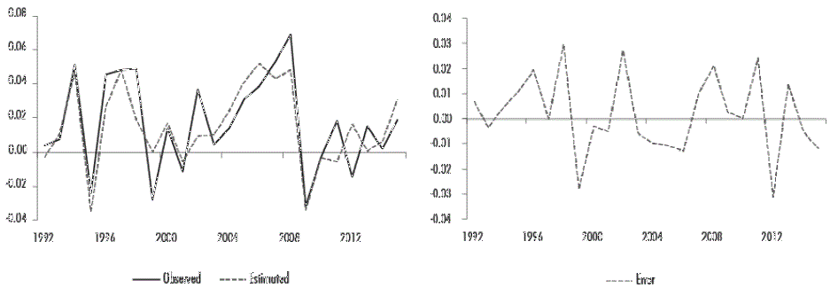 On the other hand, the errors from the final model do not report problems of normality, heteroscedasticity, and autocorrelation. In other words, there is no systematic information that can be incorporated into the model. Additionally, the short-term equation shows a good fit. This can be seen in Figure 4, which shows the observed and estimated values of CO2e emission variations. The estimation results show that, in the long term, emissions respond to the trend in the level of output and the consumption of non-renewable energies, while in the short term they follow an autoregressive process with GDP growth rate as the most important variable. The consumption of clean energies is not significant in the long term; although this variable shows a negative sign in elasticity, its impact is marginal, while in the short term, variations report a negative coefficient, but one that is not statistically significant.