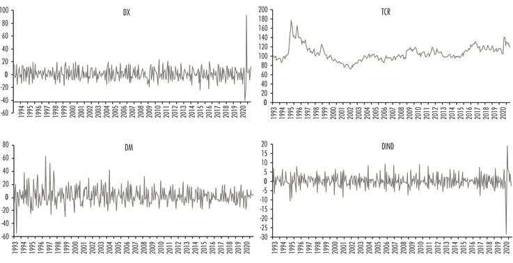 Para completar la estimación por el modelo VAR, se incluyeron dos variables que están vinculadas con los flujos comerciales; a saber, el índice de las actividades industriales manufactureras en México y el tipo de cambio real.