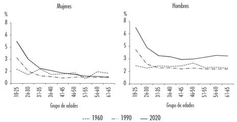 Figura 2 Tasa de desempleo por grupos de edad, 1960, 1990 y 2020 (%)