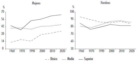 La figura 3 presenta la evolución de la tasa de participación laboral por sexo y nivel de escolaridad. En ella se observa como la escolaridad está fuertemente relacionada con los niveles de participación. Entre las mujeres, para todos los niveles de educación, se aprecia un incremento en la tasa de pertenencia a la Pea de 1960 a 2020. Entre las que tienen educación básica, su participación pasó de 12.4% en 1960 a 33.6% en 2020, mientras que entre la población con educación superior se incrementó de 44 a 64.8% durante el mismo periodo. En el caso de los hombres, los mayores niveles de participación los presentan los trabajadores con educación básica. Y esto se da por distintos motivos. Primero, el hecho que no estudien implica que se incorporan al mercado de trabajo a una edad más temprana. Segundo, debido a los menores ingresos que perciben a lo largo de su ciclo de vida laboral, se ven obligados a trabajar a edades más avanzadas. Tercero, sus menores niveles de capital humano comúnmente los orilla a laborar en el sector informal, lo que dificulta su acceso a una pensión y obliga a permanecer en la fuerza de trabajo al no tener otras fuentes de ingreso, que les permitan tener una vida digna durante la vejez.