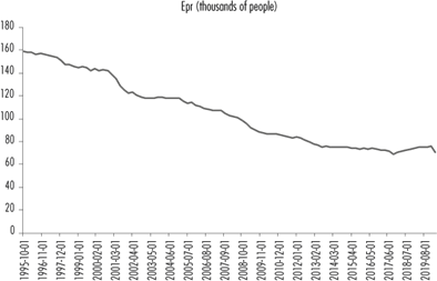 The model used in this paper will consider six variables: Manufacturing Employees in Puerto Rico (Epr t ), Manufactured Exports of Puerto Rico (Xpr t ), US imports from Mexico (Mmx t ), Canada (Mcn t ), Ireland (Mil t ), and Costa Rica (Mcr t ) from 1995Q4 to 2020Q2. The six variables are from the Federal Reserve Economic Data (FRED). Figure 1. shows the deindustrialization of Puerto Rico over time. As the figure shows, manufacturing employment in Puerto Rico has followed a decreasing trajectory; this downward trend coincides with the entry into force of NAFTA.