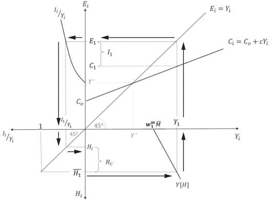 En la Figura 3, se incorpora al modelo la distribución del TDNR entre consumo e inversión. Ahora, el nuevo cuadrante ubicado en la parte superior del lado izquierdo, indica la relación directa entre la participación de la inversión Ii /Yi y el gasto (o ingreso extendido) como en la ecuación (10). Por otro lado, el nuevo cuadrante inferior del lado izquierdo representa la ecuación (9).