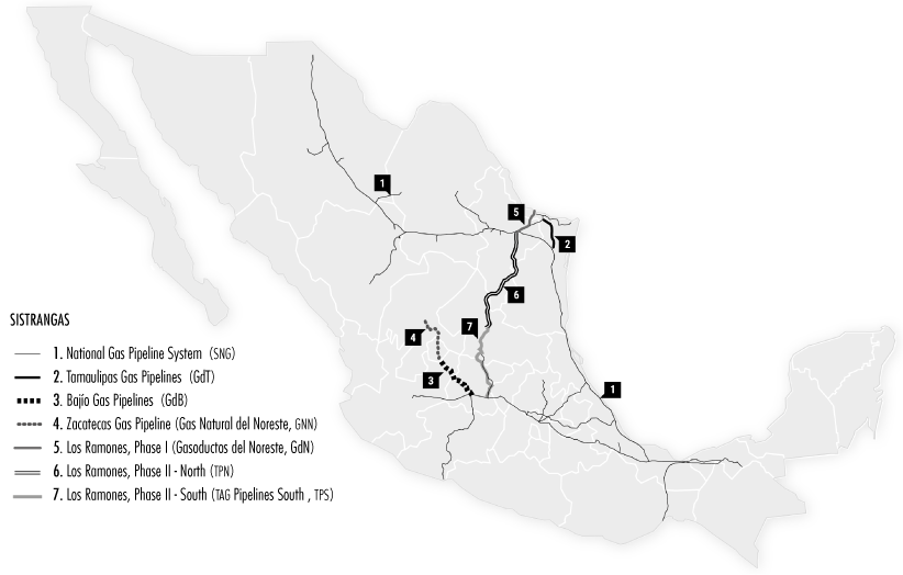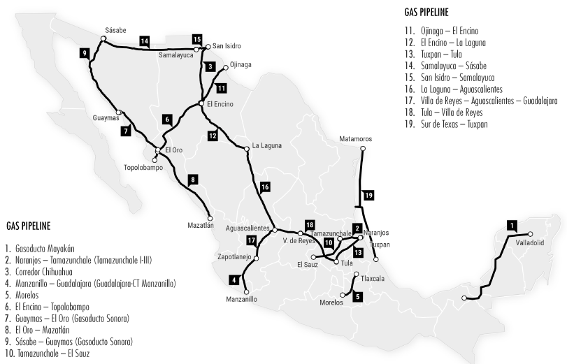 The eight gas pipelines put out to tender during the 2007-2012 six-year presidential term include those that make up the Northwest Project, comprised of the following pipelines: El Encino-Topolobampo, the Sásabe-El Oro System and El Oro-Mazatlán: El Encino-Topolobampo, the Sásabe-El Oro System and El Oro-Mazatlán. In the 2013-2018 six-year term, the gas pipelines corresponding to the Wahalajara Network, comprising the Ojinaga-El Encino, El Encino-La Laguna, La Laguna-Aguascalientes, Villa de Reyes-Aguascalientes-Guadalajara gas pipelines, were put out to tender.