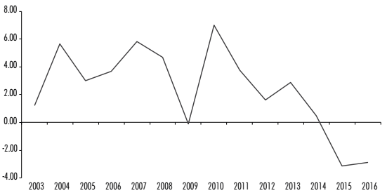 Si bien la nueva matriz logró producir una aceleración temporal del crecimiento económico entre agosto de 2012 y marzo de 2014, a partir del segundo trimestre de 2014 el ritmo de crecimiento colapsó (véase Figura 1). Esto se debió a la continua disminución del retorno sobre el patrimonio (ROE), que se tornó negativo en términos reales en 2014 (véase Tabla 1). El sector industrial fue el más afectado por la compresión del ROE promovida por la caída de la tasa de ganancia. Entre las principales causas se encuentran el aumento de los salarios por encima de la productividad laboral y la sobrevaluación del tipo de cambio, que impidió trasladar el aumento de los salarios a los precios de los productos industriales debido a la competencia de productos importados (Oreiro, 2017).