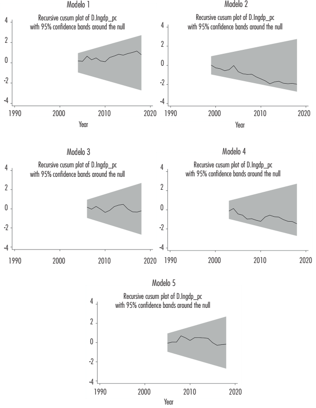 Figura A1 Prueba CUSUM para estabilidad de los modelos ARDL