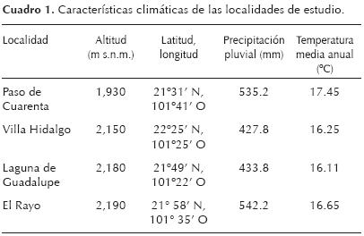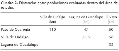 Densidades poblacionales. Las poblaciones estudiadas se encuentran rodeadas por áreas de cultivo, en las que esporádicamente se observan plantas de nopal que se encuentran formando parte de los cercos vivos. Por tal razón, es posible que algunas de estas poblaciones hayan formado poblaciones continuas. La localidad que posee mayor densidad estimada es El Rayo con 2,458 individuos ha1, mientras que en Paso de Cuarenta sólo se registraron 179 individuos ha1. Por otro lado, Laguna de Guadalupe y Villa Hidalgo tienen densidades intermedias entre ambas localidades, puesto que existen 710 y 680 individuos ha1, respectivamente.