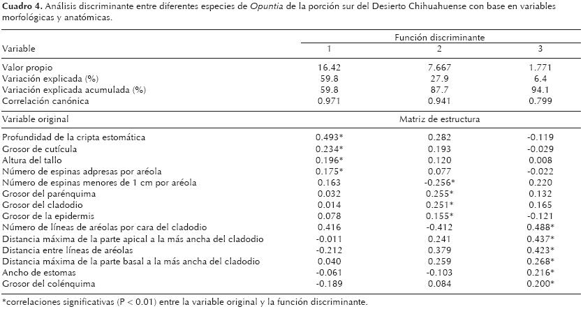 Las variables originales que presentaron correlaciones significativas con las funciones discriminantes en más de una especie fueron el grosor de cladodio, la distancia máxima de la parte basal a la más ancha del cladodio, la distancia entre aréolas, el grosor del colénquima, el grosor de parénquima, la densidad estomática y el ancho de estomas (cuadro 6).