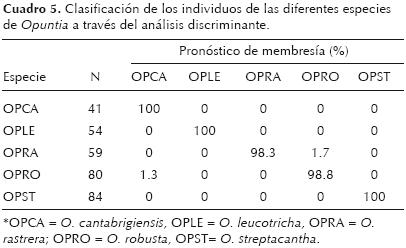 El análisis de membresía general de los diagramas 2a y 2b indica que los individuos fueron clasificados correctamente en 99% de los casos. Todos los individuos de las especies O. cantabrigiensis, O. leucotricha y O. streptacantha fueron clasificados de manera correcta, mientras que en O. robusta 99% de los individuos fueron clasificados correctamente, y 1.3% de los individuos fueron clasificados como O. cantabrigiensis. Una situación similar ocurrió en O. rastrera, ya que 98% de los individuos de esta especie fueron clasificados correctamente, y sólo 1.7% fue clasificado como O. robusta (cuadro 5).