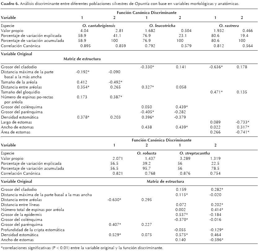 Caracterización de la variación anatómica y morfológica entre poblaciones de las especies de Opuntia. Los análisis discriminantes sobre la caracterización de la variación anatómica y morfológica de las especies de Opuntia explicaron 100% de la variación en sólo dos funciones discriminantes, excepto en las especies O. robusta y O. streptacantha, en las cuales se explicó 96 y 78.5% de la variación explicada, respectivamente. El análisis discriminante detectó nueve variables el mayor número de variables originales que logró explicar 78% de la variación de O. streptacantha, mientras que el análisis para O. leucotricha detectó seis variables, los realizados con O. rastrera y O. cantabrigiensis detectaron cinco variables, y en el de O. robusta sólo se detectaron tres variables originales, para explicar la variación total (cuadro 6).