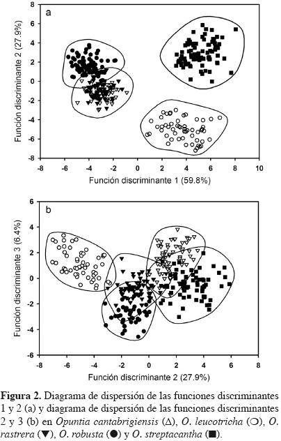 El hecho de que los individuos hayan estado perfectamente delimitados por el análisis discriminante no descarta la amplia variación morfológica que ha sido reportada en Opuntia (BravoHollis, 1978; Wallace y Fairbrothers, 1986; PimientaBarrios y MauricioLeguizamo, 1989; PimientaBarrios, 1994; PimientaBarrios y MuñozUrias, 1995; Scheinvar, 1995). Sin embargo, en esta investigación se encontró variación entre las poblaciones estudiadas, habiéndose encontrando algunas diferencias en poblaciones aisladas de forma similar a los resultados obtenidos por Bruschi et al. (2003) en su estudio con Quercus petrea.