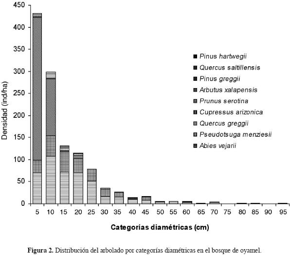 La figura 2 muestra la estructura diamétrica del bosque de oyamel de la sierra de Zapalinamé, donde la densidad se distribuye desde los 5 hasta los 95 cm de diámetro. La mayor densidad se concentra entre los 5 y 10 cm (431y 298 ind./ha respectivamente) ambas dominadas en orden descendiente por Quercus greggii, Abies vejarii y Pseudotsuga menziesii, mientras que en diámetros superiores a 30 cm, la densidad disminuye de manera importante y está dominada por Abies vejarii y Pseudotsuga menziesii.