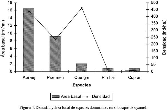 Los resultados muestran una relación inversa entre la densidad y las categorías diamétricas ya que a medida que aumenta la densidad del arbolado disminuye el diámetro de éste (figura 2). La distribución diamétrica de las especies dominantes fisonómicas del bosque de oyamel se presenta en la figura 3, donde se observa una dominancia de Abies vejarii sobre Pseudotsuga menziesii en las categorías inferiores a 40 cm. Como parte del área basal se registró un total de 29.69 m2/ha, las especies con mayor valor de área basal son: Abies vejarii y Pseudotsuga menziesii con 16.44 m2/ha y 9.24 m2/ha respectivamente (figura 4), por su parte, las especies con menor valor de este atributo son Arbutus xalapensis, Prunus serotina y Quercus saltillensis con 0.14, 0.05 y 0.03 m2/ha respectivamente (cuadro 2). La regeneración de Abies vejarii y Pseudotsuga menziesii, está integrada por plántulas con una densidad de 518,340 ind./ha y una altura de 2 4 cm, distribuida de manera irregular y se concentra en la cercanía de los árboles semillero.