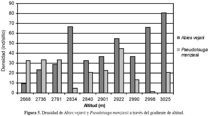 Aspectos ecológicos. La distribución altitudinal del bosque de oyamel se ubica dentro del rango de distribución de la mayoría de estas comunidades en México, así, Rzedowski (1978) describe bosques de oyamel en sitios con altitudes que van de 2,400 a 3,600 m; para bosques de Pseudotsuga, Pinus y Abies en la Sierra de Arteaga, Coahuila, CornejoOviedo (1987) reporta altitudes entre 2,700 y 3,360 m, de igual forma AguirreCalderón et al. (2003) en el cerro El Potosí describe un bosque de Abies, Pseudotsuga y Pinus en altitudes de 2,925 a 3,325 m. La distribución altitudinal de Abies vejarii en la sierra de Zapalinamé es superior a los bosques de Abies religiosa y A. religiosa var. emarginata, de la sierra de Manantlán, Jalisco, los cuales se desarrollan entre 2,187 a 2,261 m (FigueroaRangel y Moreno, 1993) y a los bosques de Abies guatemalensis de la sierra de San Carlos, Tamaulipas, que prosperan en altitudes de 1,300 a 1,400 m, en laderas con pendientes fuertes (Briones, 1991). La densidad y el área basal de Abies vejarii se incrementan notablemente conforme se aumenta la altitud, esta tendencia coincide con lo reportado por Cornejooviedo (1987); de igual forma AguirreCalderón et al. (2003) reportan para el cerro El Potosí, Nuevo León, bosque de oyamel con dominancia de Abies vejarii en sitios de 3,300 a 3,600 m de altitud, asimismo, ÁvilaBello y LópezMata (2001) en los bosques de Abies hickelii en México, registraron un incremento en la dominancia de esta especie en sitios con altitudes que oscilan entre los 3,000 y 3,600 m.