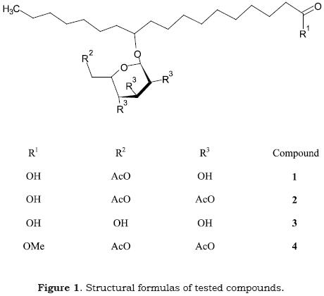 Compound 1 was isolated and identified as previously described (Cerdeiras et al., 2000). Compound 2 and 3 were obtained by acetylation of 1 with Ac2O/Pyridine and mild alkaline hydrolysis respectively. Compound 4 was synthesized from αbromotetraacetylglucose and methyl 11 hydroxyoctadecanoate by the classical KoenigsKnorr method using Ag2O as catalyst (Talley, 1963). The resulting compounds were identified by different GCMS, HRMS and NMR techniques. Compounds 5 (12hydroxy9octadecenoic acid) and 6 (methyl 11hydroxyoctadecanoate) were purchased from Sigma.
