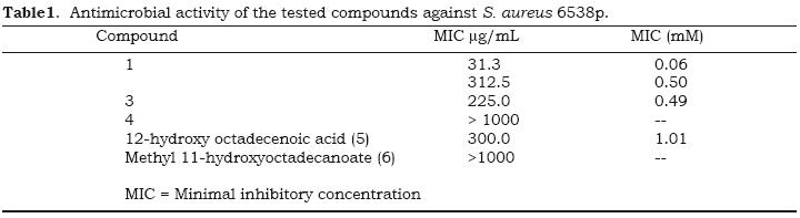 El compuesto 1 (11hydroxiestearil 110(60acetilβDglucopiranósido) mostró una MIC de 0.06 mM para S. aureus ATCC 6538p. También mostró actividad antibacteriana contra diferentes cepas de MRSA mientras que todos los análogos de 1 tuvieron MICs mayores que el producto natural. Estos resultados sugieren que tanto la función acido como la estructura glicosídica son necesarias para la actividad.