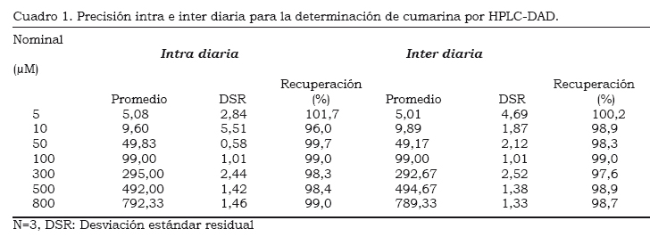 Se evaluaron la repetitividad y precisión mediante el análisis en un mismo día y en tres días diferentes siete muestras a diferentes concentración (5, 10, 50, 100, 300, 500 y 800 μM de cumarina).