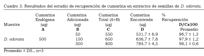 El estudio del porcentaje de recuperación en muestras de extractos dopadas con una cantidad conocida de cumarina, encontrando los porcentajes de recuperación mostrados en el cuadro 3. En general, un porcentaje de recuperación de un 97,5% es encontrado para el análisis de cumarina en los extractos de semilla de D. odorata.