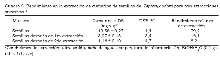 Desde un punto de vista cuantitativo, es necesario determinar el nivel de extracción que se alcanzan aplicando el mismo protocolo de extracción de manera secuencial a una misma muestra. Esto permite evaluar la eficiencia de la extracción, y determinar la significancia de usar o no más de un proceso de extracción a la muestra. Así, se realizó una secuencia de extracciones a una muestra de semillas. El cuadro 5 resume los niveles de cumarina encontrados en tres extracciones secuenciales, donde se indica que cerca del 80% de la cumarina existente en la muestra es extraída en una sola extracción, mostrando una buena re-producibilidad del resultados, un %DSR < al 2%. Así, en el caso de análisis secuencial de muestras, no es necesario realizar más de una extracción, pues esto conllevaría a un aumento en el tiempo de análisis de muestras, así como gasto de solventes. Considerando esta extracción sucesiva, el contenido de cumarina en semillas asciende a un 2,45% en peso.